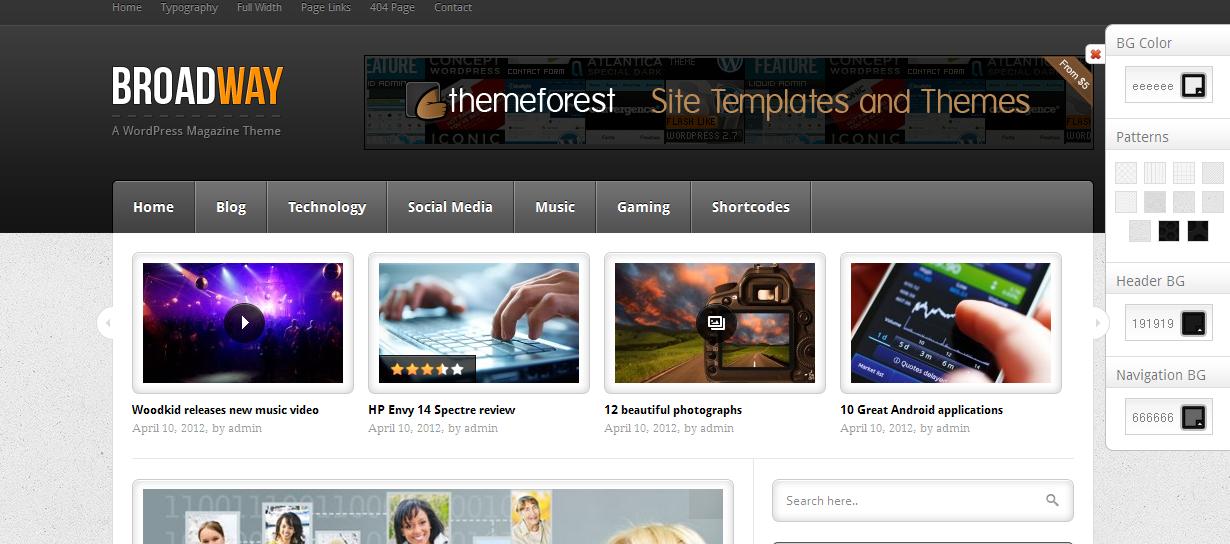 Шаблон «Бродвей» предусматривает два стиля- тип блог, тип журнал. По умолчанию домашняя страница выполнена в журнальном стиле. Вы можете активировать блог. Рекомендуемые Slider сообщения- вы можете изменить эффект и скорость между слайдами. Скорость признакам слайдер сообщений в миллисекундах, 1000 миллисекунд = 1 секунде.