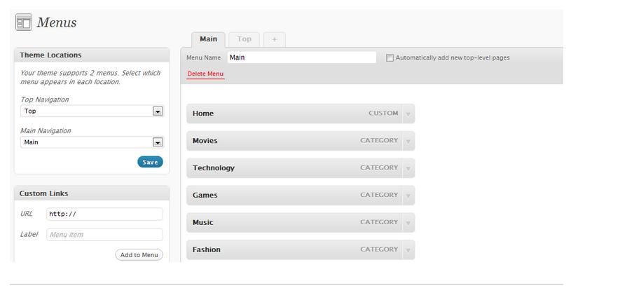 Для настройки меню, перейдите к Внешний вид -> меню страницы. Введите имя для вашего меню, и добавить ссылки в меню с помощью параметров, заданных на левой боковой панели. Вы можете управлять меню с помощью перетаскивания. Верхней панели навигации не является обязательным и он не будут активным, пока вы назначаете меню верхнего расположения навигации.
