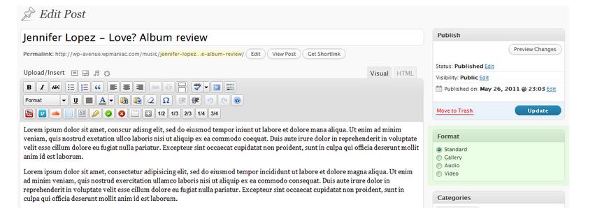 Вы можете установить формат сообщению в WordPress странице редактора поста. Бульвар поддерживает три типа сообщение формата: